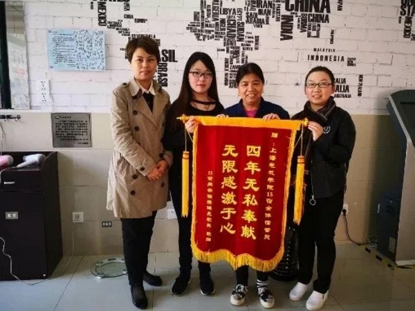 图说:小陆和家人为老师和宿管阿姨送上锦旗 上海电机学院供图(下同)