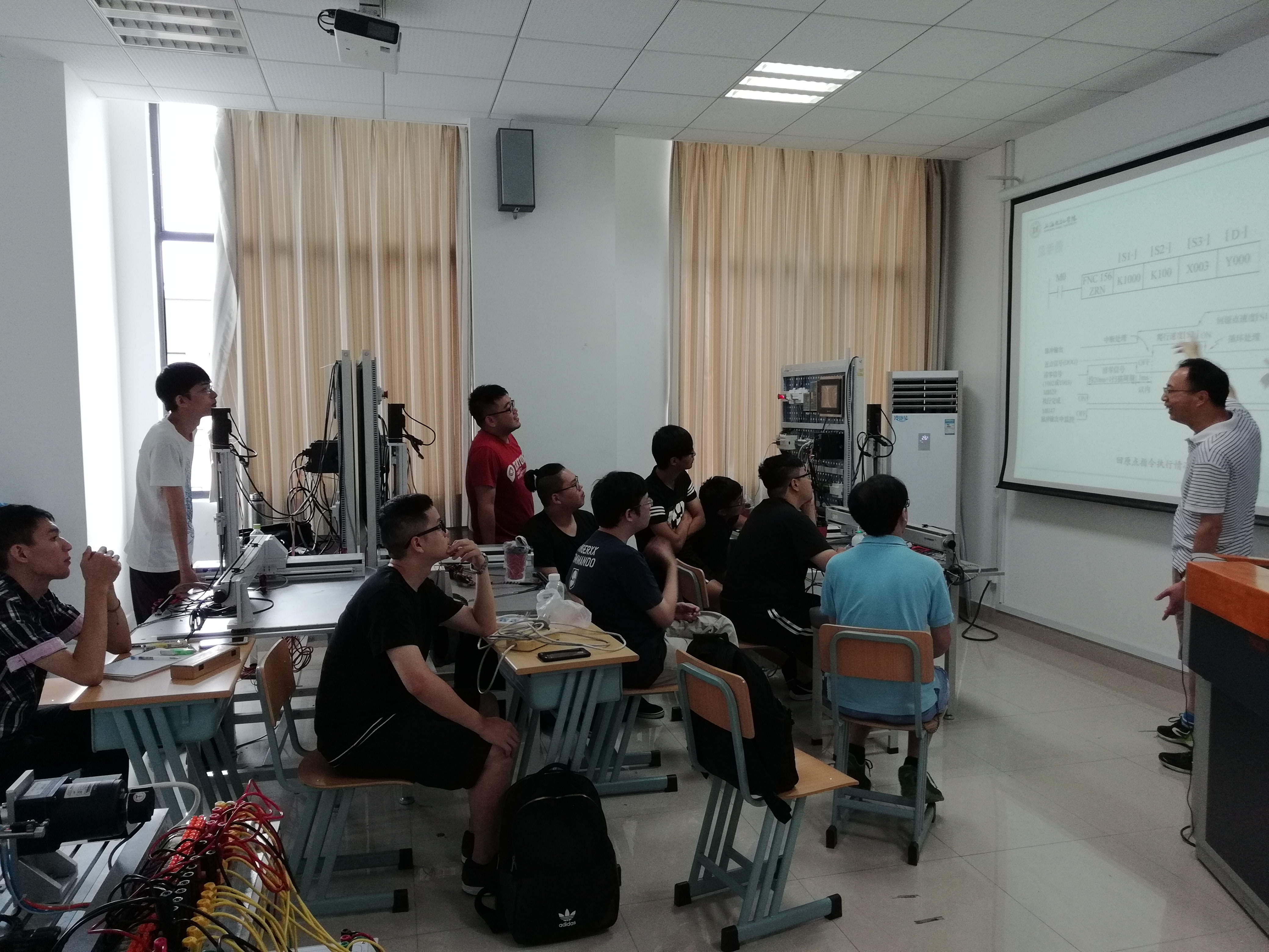 在为期一周的学习中,机械学院汪烨老师为学习团学生们主讲了“PLC机电系统进阶综合实践”课程。课程内容根据学生们已有的技术基础制定,着重在PLC与HMI的工程应用、PLC的步进电机控制工程应用、交流伺服电机控制工程应用、PLC数据采集系统的应用与实践等方面进行讲解与实践。课程在机械电子工程专业实验室进行,“边讲边练”的模式受到学生的欢迎。机械学院实验中心钱炳锋老师参加了学生实验的指导。