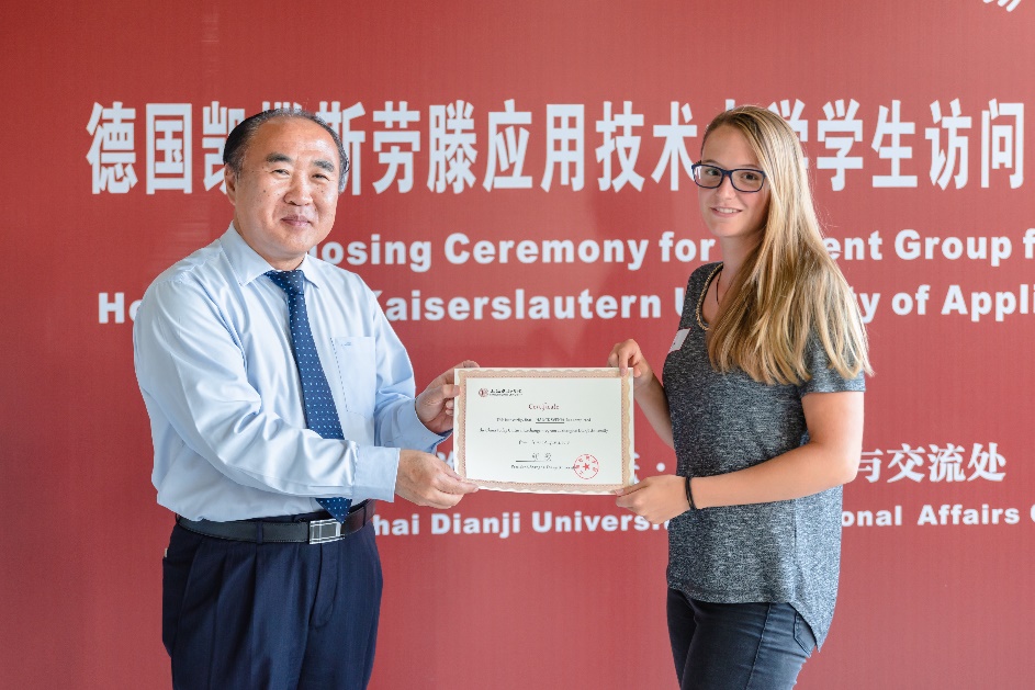 最后,胡晟校长致辞。胡校长在讲话中回顾了两校十六年的合作与交流历史,自2003年两校开启合作至今,双方已签署了十份合作协议。我校中德智能制造学院的成立,更是得到了凯撒斯劳滕应用技术大学的大力支持,中德双方在人才培养方面的紧密合作,使两校间的关系更见密切。胡校长提到,中德智能制造学院有24位学生通过了德语水平测试,获得了前往凯撒斯劳滕应用技术大学深造的机会。他希望今后能有更多学生前往德国学习,也希望两校的合作越来越好。结业典礼上,胡晟校长为凯劳学生团的学生们一一颁发结业证书并合影留念。