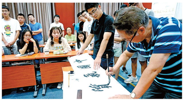 本报讯 (记者 符佳)9月10日,“传统文化直通车”驶入位于临港的上海电机学院,为这所以工科见长的学校带来了浓郁的人文艺术气息。校园里响起了民乐声声,有奖猜谜活动、民间手工艺表演吸引了千余名师生的积极参与,而知名书法家、中国书法家协会会员张天民和矫健的现场创作和讲解,更让不少师生惊叹于“书法艺术中所蕴含的中国气质”。