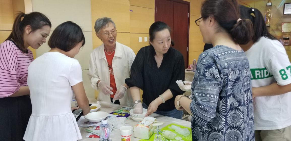 在制作月饼过程中,大家围坐在提前准备好冰皮粉、馅料、模具、包装盒等各种材料的桌子前,仔细看着制作步骤和方法,共建单位的党员和社区居民一起,和粉、揉面、取馅、入模、压实、脱模成型,一个个完美的冰皮月饼在来大家的手中制作完成。大家围在一起有说有笑,交换馅料和模具,洋溢欢乐喜庆气氛,一盒盒不同花案的冰皮月饼“诞生”了。