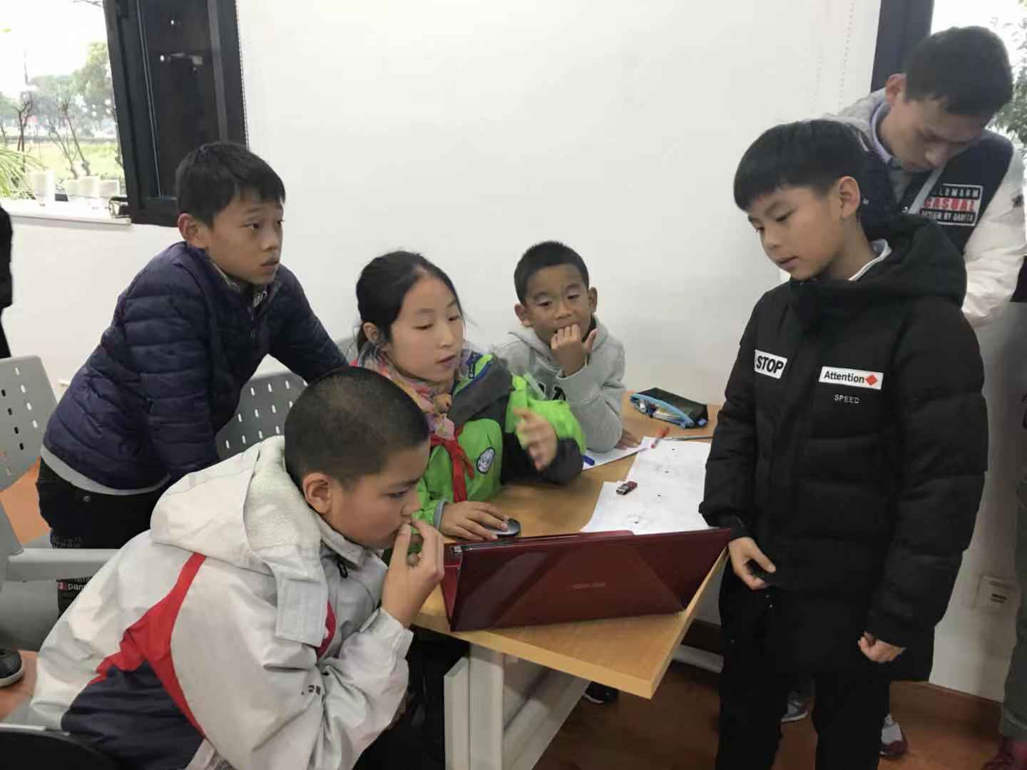 接下来的Tello编程学习环节,在研究生的指导下,小朋友们逐渐掌握了无人机简单编程控制,能够运用三角几何原理分析空间位置并通过编程实现特定飞行动作,小朋友们热烈讨论各种可行方案,很有成就感。