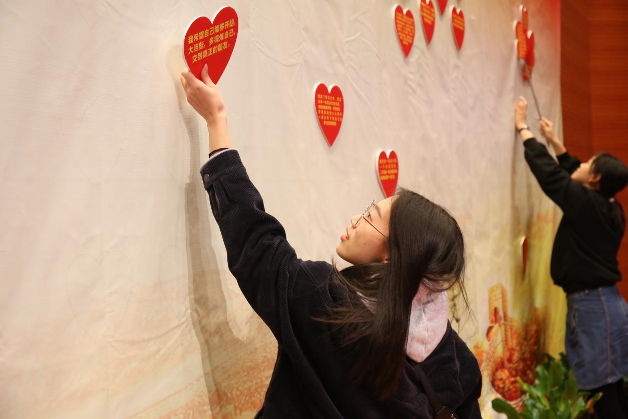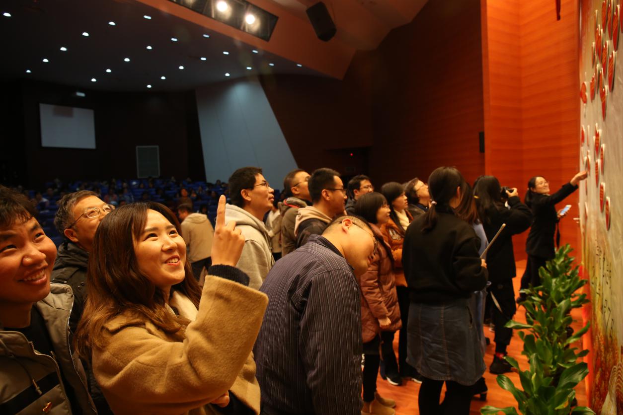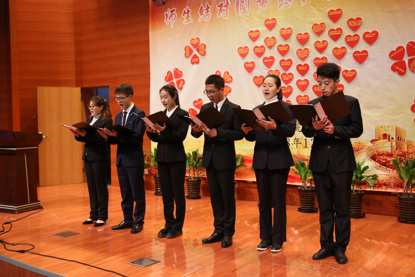 商学院党总支副书记、副院长陈秀春介绍了此次结对帮扶活动的基本情况以及本次启动仪式程序。此次活动由商学院党总支在校党委统一部署下举行,为提高结对帮扶的实际效果,切实解决困难学生的难题,经学院党总支充分讨论,此次结对仪式采取了新的方式。活动前期认真遴选了困难同学名单,并征集了同学们需要解决的问题或需要实现的心愿,制作成爱心的图案张贴在主席台上,随后党员教师上台随机挑选心愿,选择自己能力范围内能够帮助同学解决的问题,摘下爱心后,即可在背面获取该同学的班级、姓名和微信二维码,进行现场结对。