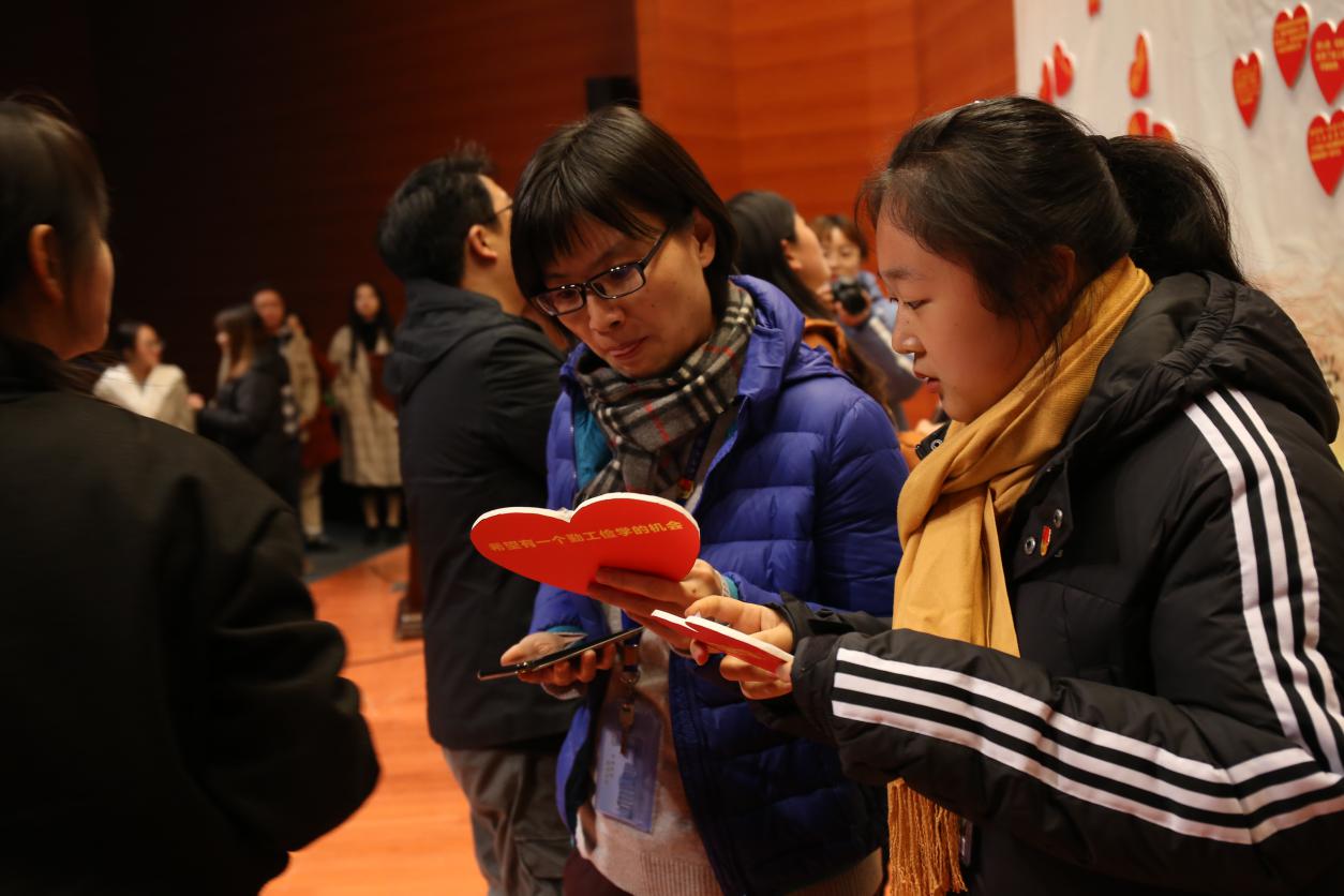 随后结对仪式正式开始。党员教师们依次上台,认真阅读同学们的心愿卡,慎重选择心愿,然后通过扫取爱心背面的二维码实现结对,进行沟通交流和后续帮扶安排。