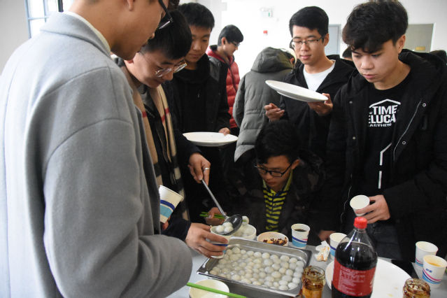 学生分会主席杜镇极同学作为代表向大家介绍了冬至的由来和传统,提醒大家在品尝水饺和汤圆的同时,不要忘了一直关心大家的亲人,叮嘱大家今晚打个电话回家,问声好,报个安,拉拉家常,讲讲近况。他还建议同学们认真复习,诚信考试,力争取得好成绩,模范遵守校园规章制度,共同维护好校园的大安全。