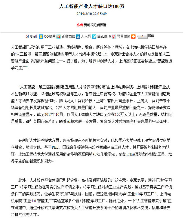 【劳动报】人工智能产业人才缺口达100万