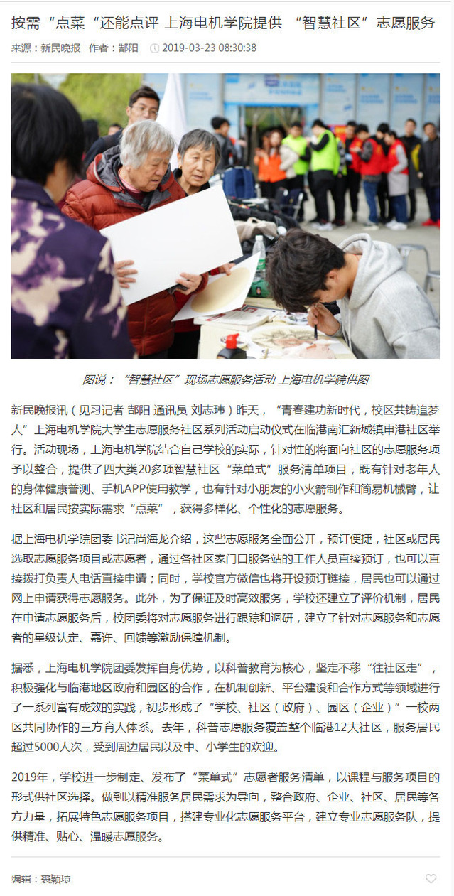 【新民晚报】按需“点菜“还能点评 上海电机学院提供 “智慧社区”志愿服务