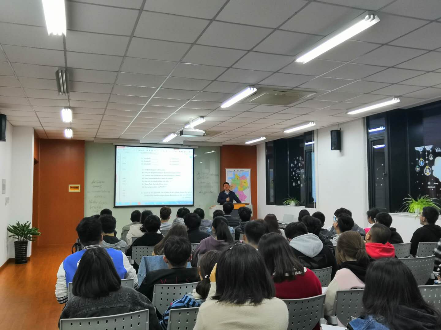 中德学院以目前正在进行的德语强化培训为契机,德语教学中心老师与外教齐上阵,就德语、专业内容等开展系列学习活动。德语老师定期给学生就心理调适、目标梳理、行动方向等内容做德语四级考前辅导。