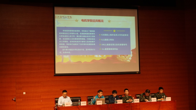 武装部孔祥昆老师通过征兵概况、入伍流程、退役优抚、典型案例、常见问题答疑和参军入伍的意义等六个方面向同学们进行全面讲解。他重点向同学们讲解了应征入伍的条件和退役优抚政策,一方面,他把具体的体检要求、男女兵入伍程序等参军入伍条件传达给在场同学;另一方面,他还把国家、上海市、闵行区和学校层面对于退伍大学生士兵的优抚政策向同学们进行具体讲解;最后,他还向同学们介绍了今年学校征兵工作的基本情况,让同学们对今年我校征兵工作有了大致了解。