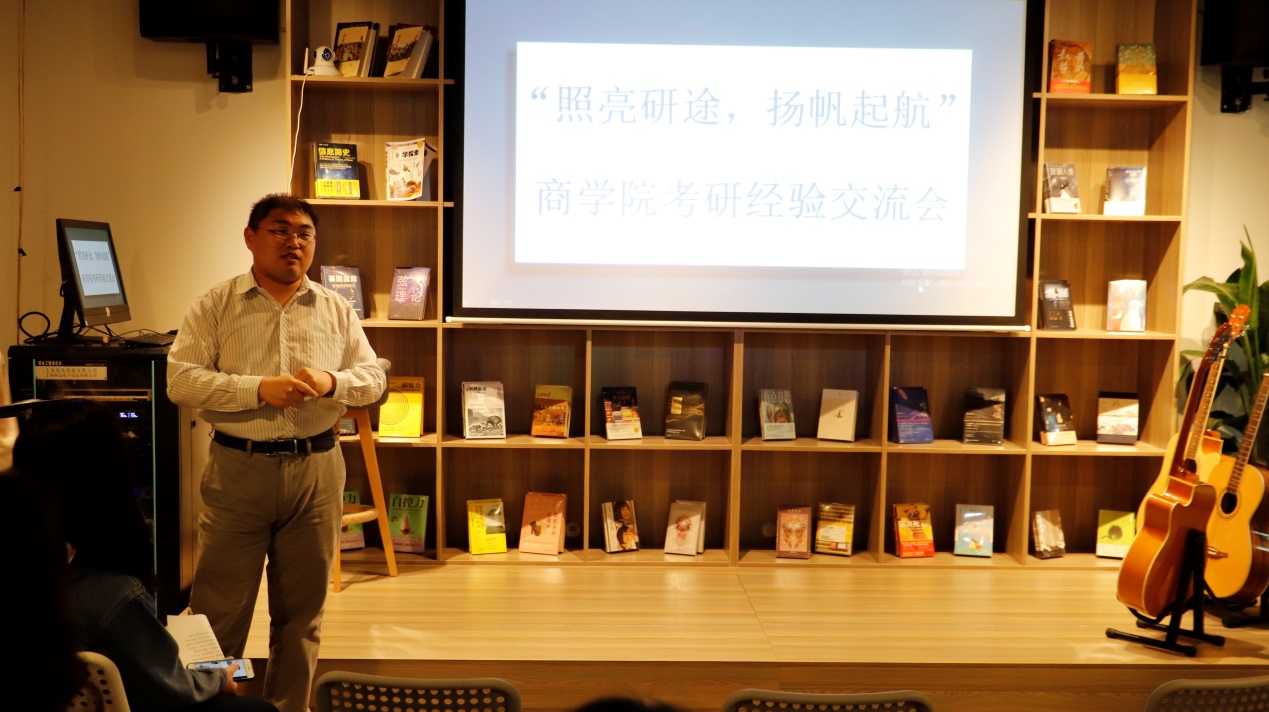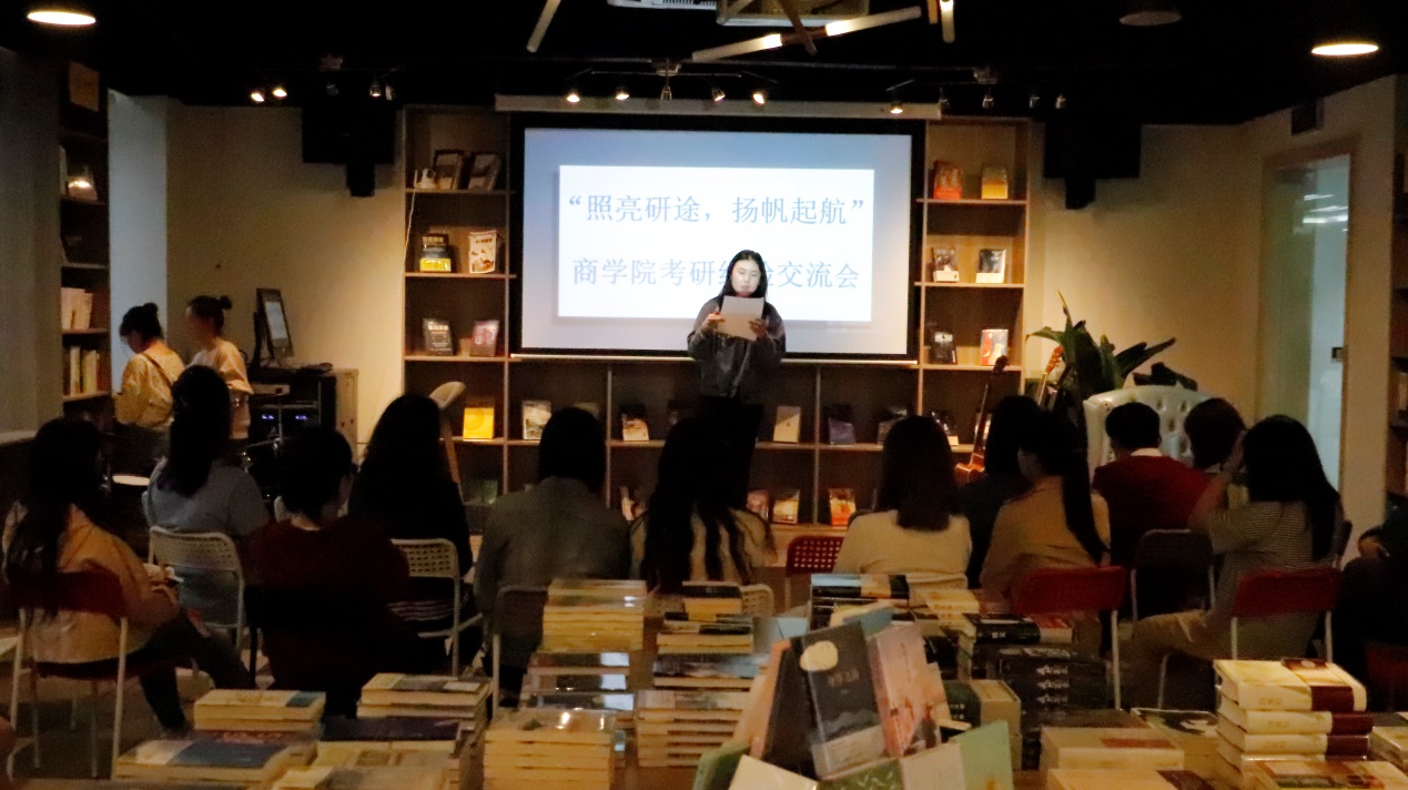 4月24日晚,商学院“照亮研途,扬帆起航”交流会于“壹书屋”成功举办。商学院2019届毕业生黄点(拟录取为湖南商学院新闻与传播专业硕士研究生)、王雪霏(拟录取为四川师范大学会计专业硕士研究生)和崔衍旺(拟录取为上海大学区域与全球问题专业硕士研究生)等三位同学作为分享嘉宾,同现场师生五十余人参加了此次活动。活动由张沁同学主持。