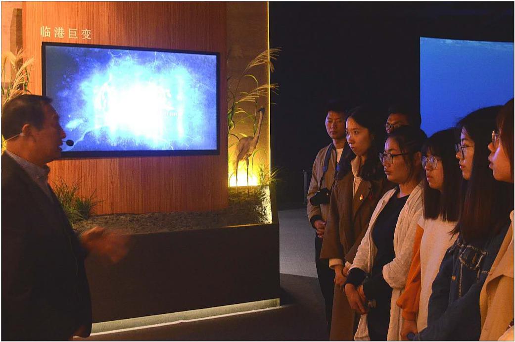 首先,在展示厅内,由南汇新城社区党校施斌老师为上《历史长河中的那抹红》的情景党课。通过讲解临港发展的历史,引申出临港在历史长河中的感人故事和抗战时期的红色革命精神,其中包括南汇县第一县委书记周大根的感人事迹,还原泥城暴动建立中农红军22军,成立了南汇县保卫团第二中队的历史故事,打响浦东抗日第一枪的汇角战役等红色革命故事。通过施老师的生动讲解,带领同学们回顾了临港发展的昨天,同学们不禁感慨这片土地上孕育了这么多无怨无悔,一心为国的志士仁人。