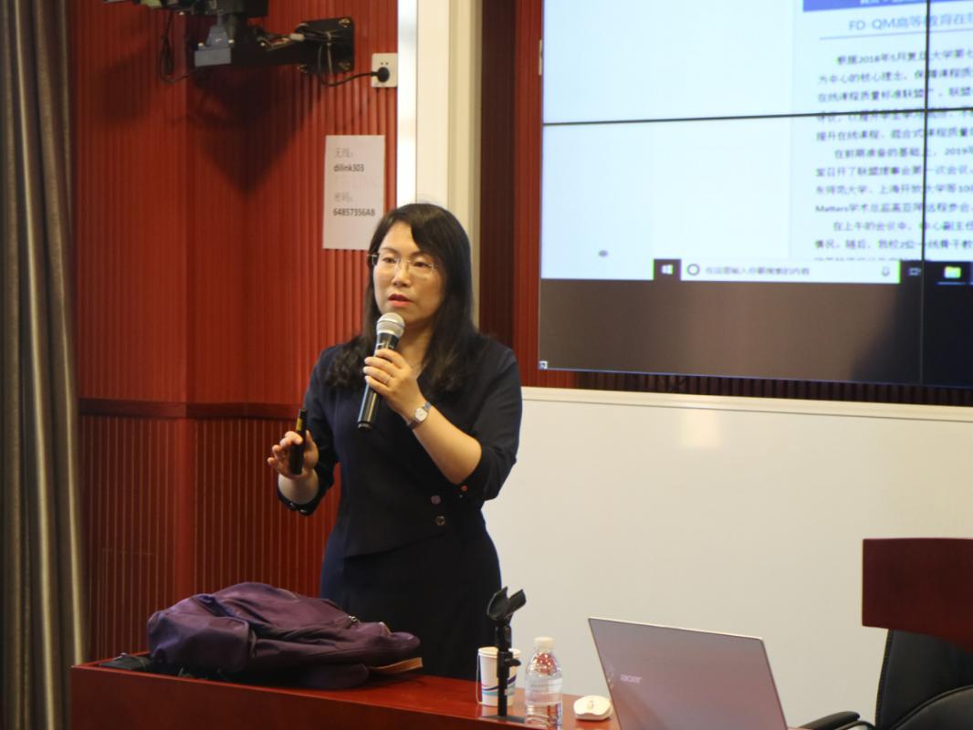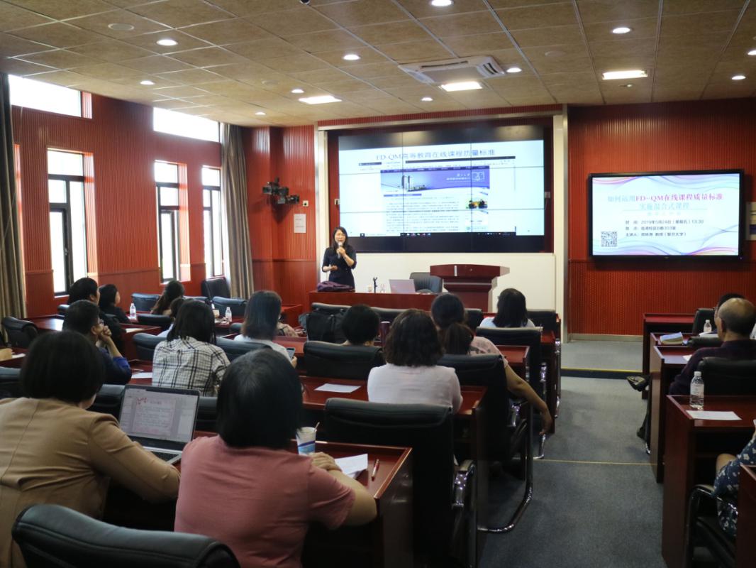 5月24日下午在临港校区B教303教室,教师教学发展中心组织了本学期第8次教学工作坊,本次邀请复旦大学外文学院郑咏滟教授为主讲嘉宾,分享题为《如何运用FD-QM在线课程质量标准实施混合式课程》的精彩内容。现场座无虚席,共计60余名教师参加。
