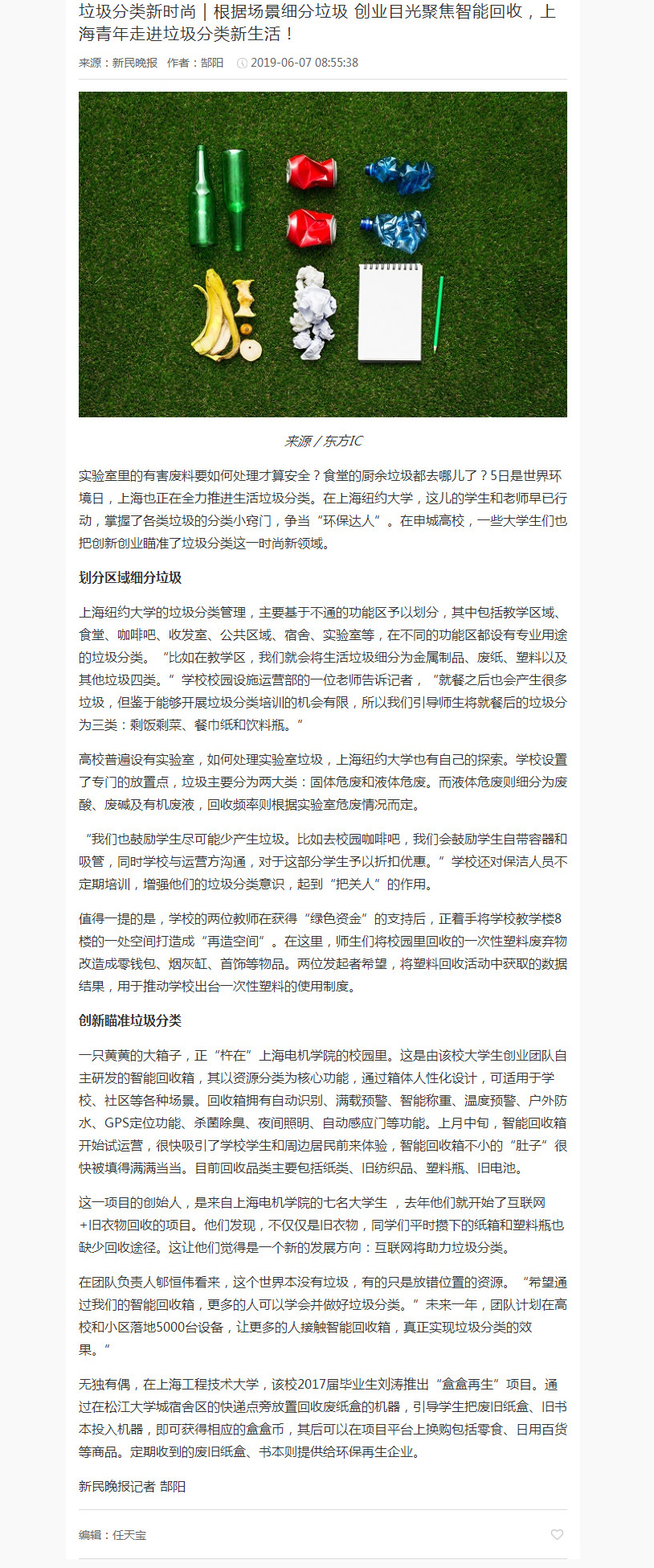 【新民晚报】垃圾分类新时尚|根据场景细分垃圾 创业目光聚焦智能回收,上海青年走进垃圾分类新生活!