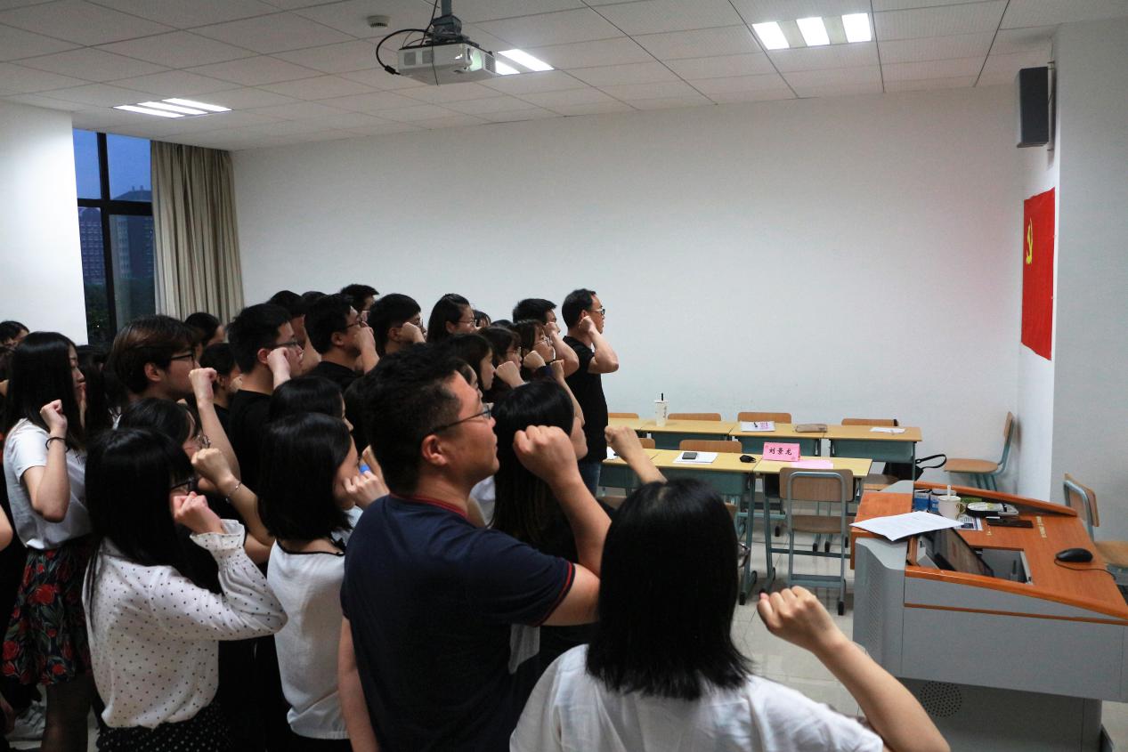 面对党旗进行入党宣誓,是每一位党员都经历过的庄严神圣的仪式,其意义不止于一个简单的动作,而在于宣誓忠诚、牢记使命、坚定信念,重温入党誓词,让红色基因永远传承。在孙慧老师的带领下,全体起立,面向党旗,举右手握拳过肩,重温入党誓词。