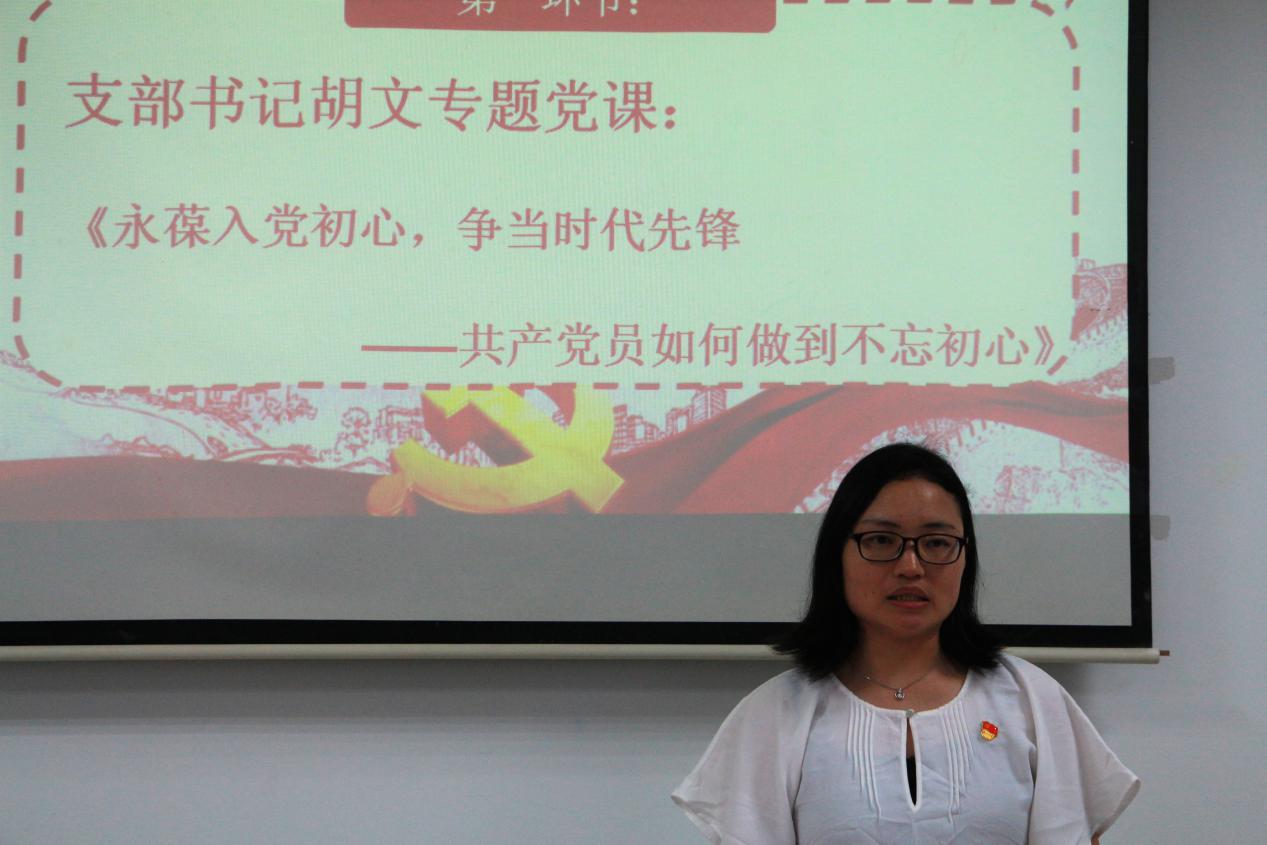 第七党支部书记胡文首先以永葆入党初心,争当时代先锋——共产党员如何做到不忘初心为题为大家上专题党课她以95岁老党员张富清同志60多年深藏功名的事迹为例,讲述了张富清同志用自己一辈子的行动,践行了一名中共党员的不忘初心。不忘初心,意味着责任如山,意味着担当如铁,意味着奉献如常。作为共产党员,就应该平常时候看得出来,关键时刻站得出来,危急关头豁得出来。