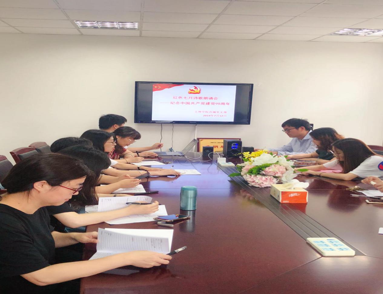 7月12日下午,文理学院直属党支部在文理楼313会议室举行了红色七月诗歌朗诵会,旨在使全体党员从红色诗歌中重温中国共产党成长、发展、壮大的辉煌历史,感受红色诗歌的魅力,使大家更加坚定对党的信仰。直属党支部全体党员教师参加了本次主题党日暨组织生活会,会议由直属党支部副书记袁亮主持。
