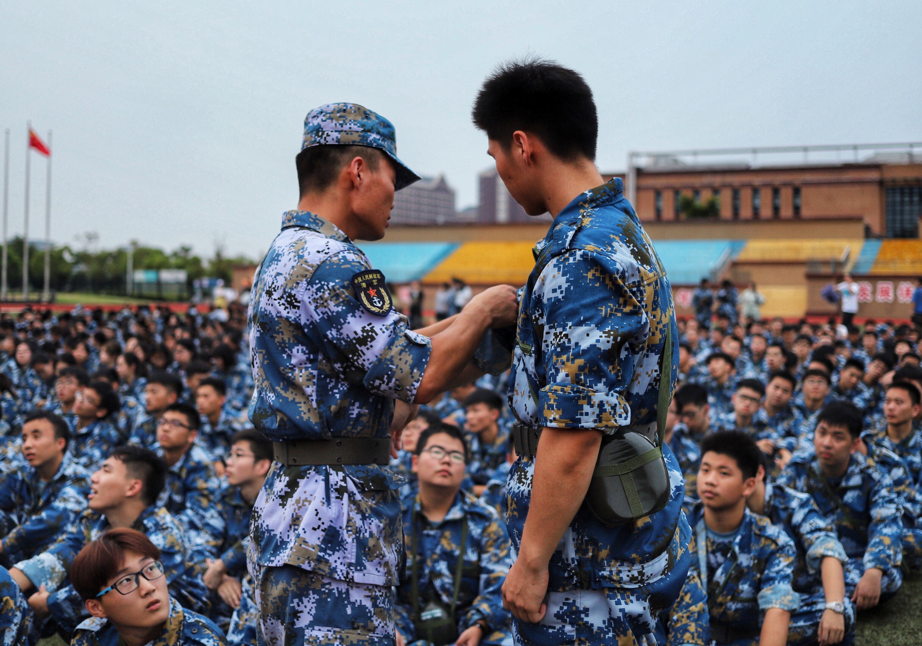 8月27日,上海电机学院机械学院的大一新生迎来了他们大学的第一课——军训。下午三点半,在指导员和志愿者的带领下,机械大一小萌新整齐待命,满怀期待地在学校操场上第一次与教官见面。