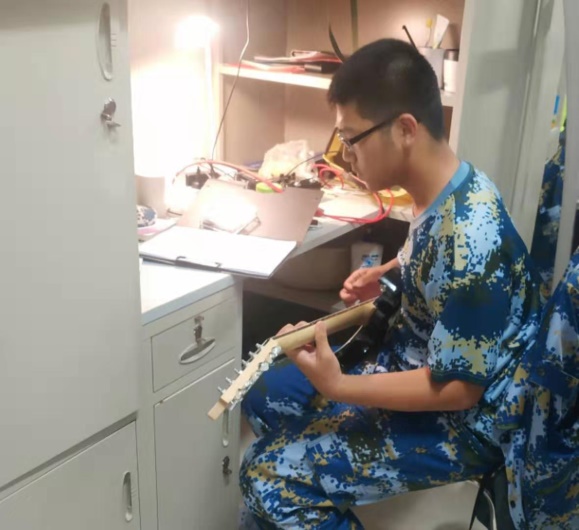 在查寝过程中遇到正在练习吉他的学生,给前来查寝的老师带来即兴表演。