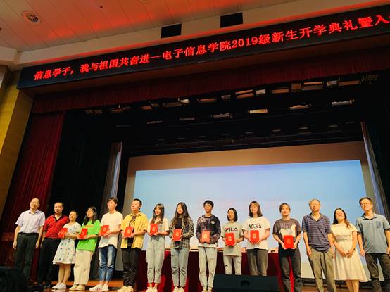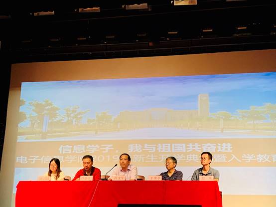 9月11日晚,电子信息学院2019级本科新生开学典礼暨新生入学教育在临港校区学生事务中心小剧场隆重举行。电子信息学院党总支书记蒋建军、电子信息学院院长计春雷、副院长王淮亭、副院长黎明、电子信息学院专职组织员陆平老师、全体辅导员老师、2019级优秀班助班志代表以及2019级全体本科新生参加本次大会。伴随着《我和我的祖国》的乐曲,典礼拉开序幕。全场挥舞国旗,共同高歌,用歌声表达出信息学子与祖国共奋进的心愿。