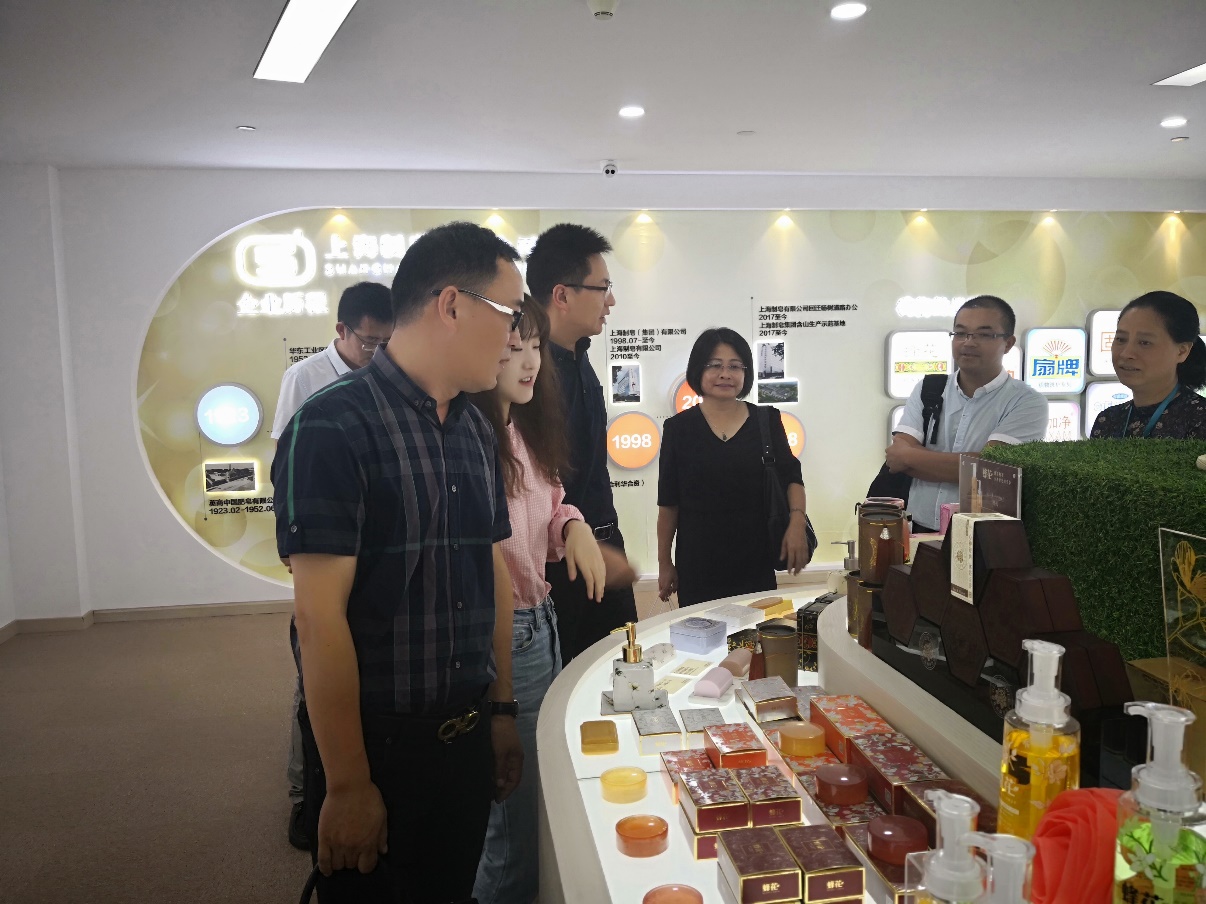 王珍明代表公司对项军书记一行的到来表示热烈欢迎。他表示,上海制皂有限公司是专业生产和销售个人清洁用品、家居清洁用品和织物洗涤用品的专业企业。公司科研技术先进,生产设备优良,产品门类齐全,以天然油脂加工而成的绿色标志产品为主,安全可靠、物有所值。公司的“蜂花”品牌三次荣获《国家质量银质奖》,蜚声中外。在王总经理的陪同下,调研团参观了公司品牌孵化园及产品陈列馆,了解公司的产品生产坏境、发展历程以及取得的成果。