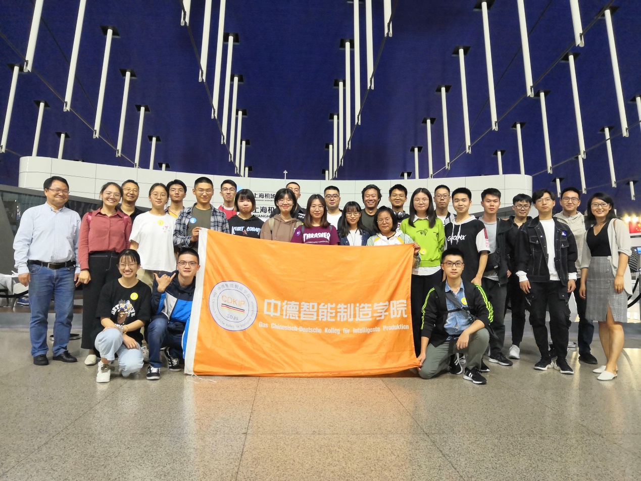 9月23日,中德智能制造学院2017级物流、电气、机电三个专业25名同学在浦东国际机场乘坐飞机前往德国凯撒斯劳滕应用技术大学,开启为期两年的国外学习。中德智能制造学院副院长副书记苏庆刚、德语教学中心主任郭正毅、专业教师李晓梅、刘将将以及2017级班主任张艺群前往机场送行。