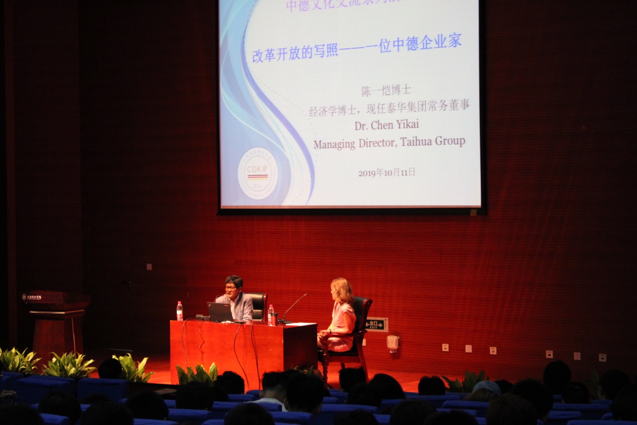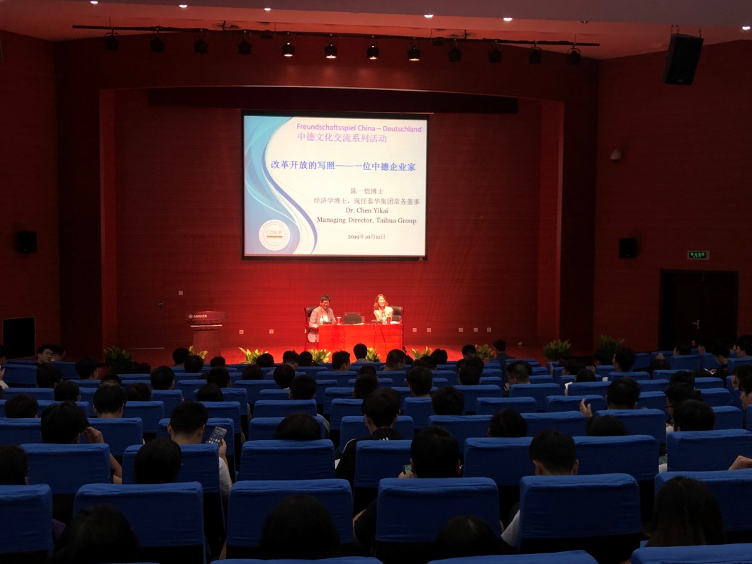 2019年10月12日,智能制造(中德)学院于图书馆报告厅举行“中德文化交流系列活动” (Freundschaftsspiel China - Deutschland)的第二场讲座,即“改革开放的写照 ― 一名中德企业家”。本次活动邀请了泰华集团常务董事陈一恺博士。陈一恺博士毕业于浙江大学经济工程专业,后留学德国并获得慕尼黑大学经济学博士学位,他曾就职于西门子项目投资公司,担任中国区总经理;他开设的“慕华项目开发有限公司”给中国中小企业设立了全球化的销售渠道,帮助中国的中小企业走向世界。陈博士在德国已生活数十年,对德国社会文化有深入的独到理解。本次讲座由中德学院德方院长凯茜博士(Silvia Kettelhut)主持。