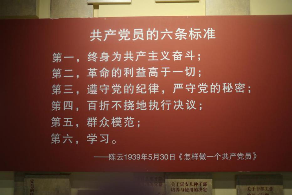 在史料文物中,有一块红色展板展示了共产党员的六条标准,是陈云同志于1939年5月30日在《怎样做一个共产党员》中所提出的。党员教师们纷纷拍照收藏,并表示不管在哪个时期,作为一名共产党员就是要时刻牢记自己的使命,坚决履行党员义务,坚持我们党的三大优良作风,在自己的岗位体现共产党员的先锋模范带头作用!