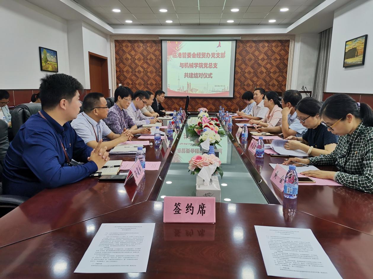 7月1日,中国共产党98岁生日当天,机械学院党总支与临港地区开发建设管理委员会经贸办党支部进行了党建结对,以“共建促党建,共建促作风,共建促提升,共建促发展”为目标,以“结对共建”活动为纽带,促进政府部门与学校之间的工作联动。经贸办党支部定期派党员到机械学院宣传临港管委会的政策、产业规划、企业布局,帮助机械学院对接临港地区智能制造企业,交流企业的科技服务需求。