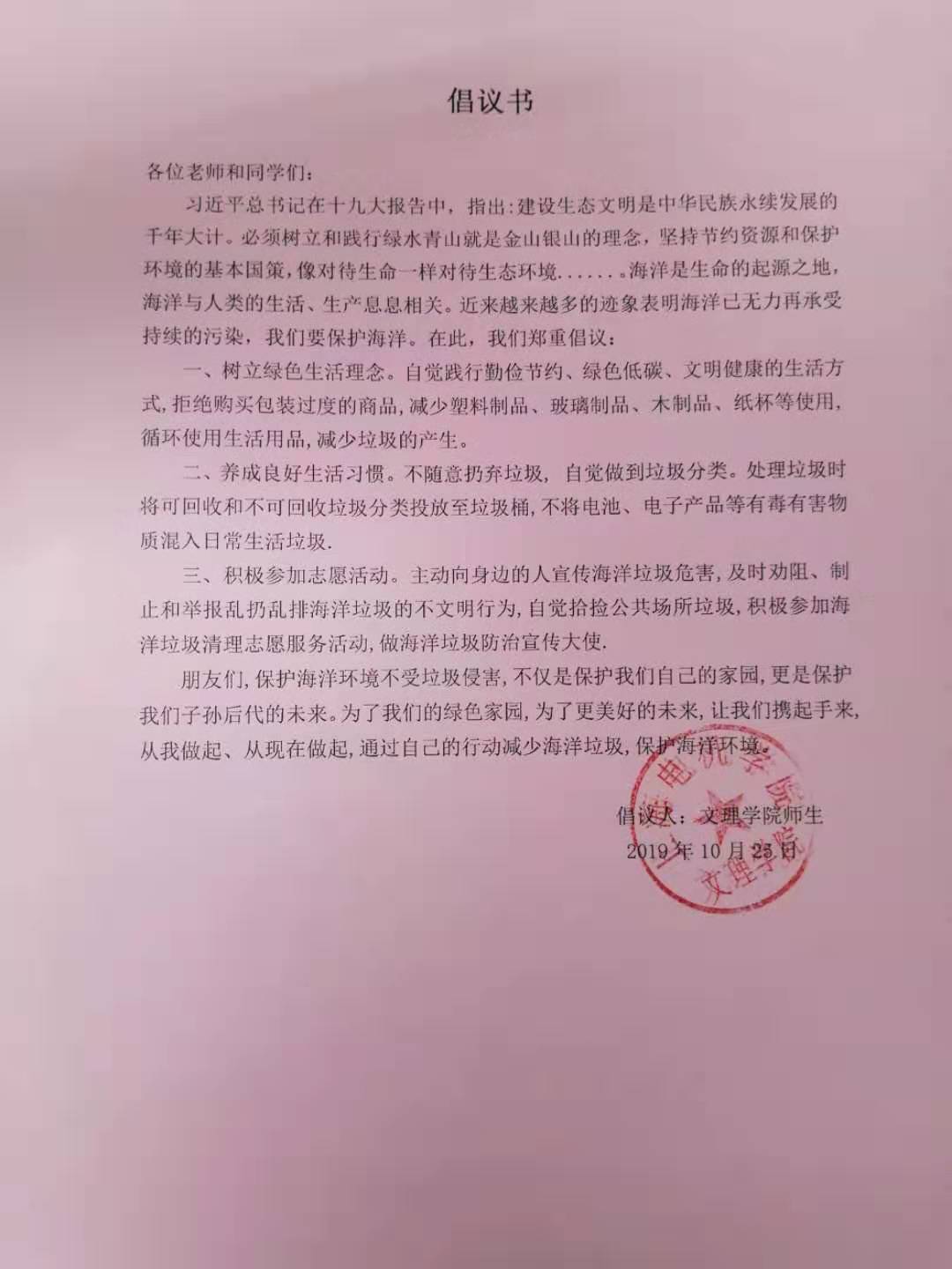 为深入开展“不忘初心、牢记使命”主题教育活动,10月25日下午,文理学院组织全体党团员开展了以“清洁海滩,倡导生态文明”为主题的环保志愿服务活动,为党团员提供了一次主题教育的实践机会。党员和团员青年们来到南汇新城“天空之境”清理海滩上的垃圾,并发起“减少海洋垃圾,保护海洋环境,建设生态文明”的倡议书。