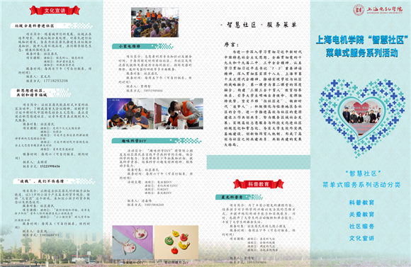 长期以来,上海电机学院在科普教育工作中紧抓学科专业优势,着力打造具有自身特色的科普服务模式。在学校与社区间创建“智慧社区”服务菜单,提供四个大类20多项“菜单式”服务清单项目,通过居民喜闻乐见的形式渗透科学知识,实现科普和生活完美结合。