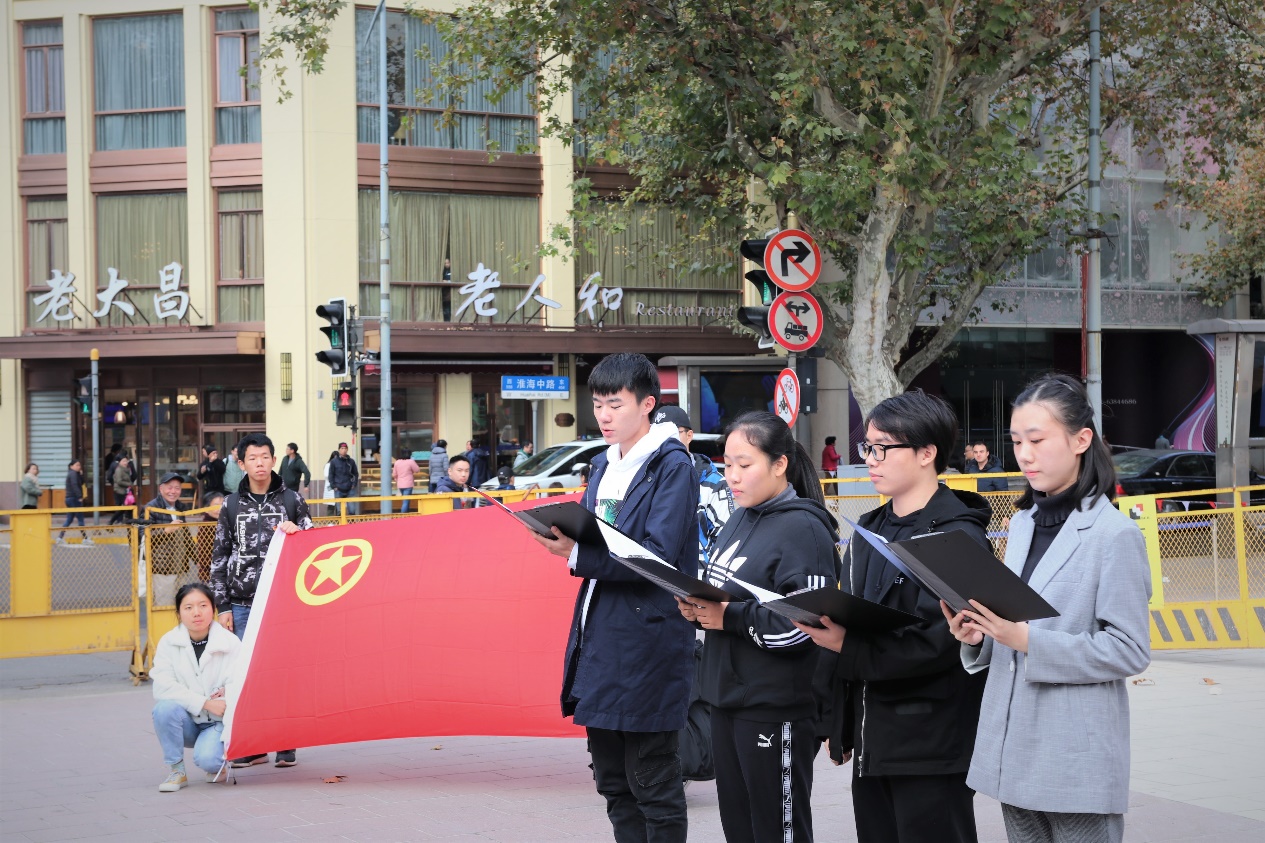 在渔阳里广场上,被云层覆盖着的天空终于洒下了缕缕阳光,身后的“五四运动”纪念浮雕与迎风飘扬的五星红旗构成了一幅灿烂而瑰丽的画卷。全体团干部在“渔阳里”石雕前重温入团誓词,设计与艺术学院和高职学院的四名团干部代表带来主题为《初心与使命》的朗诵节目,字字铿锵、掷地有声,随着他们的朗诵,仿佛让人想起了革命先辈们的峥嵘岁月,也就此打开了这段红色记忆之旅的帷幕。