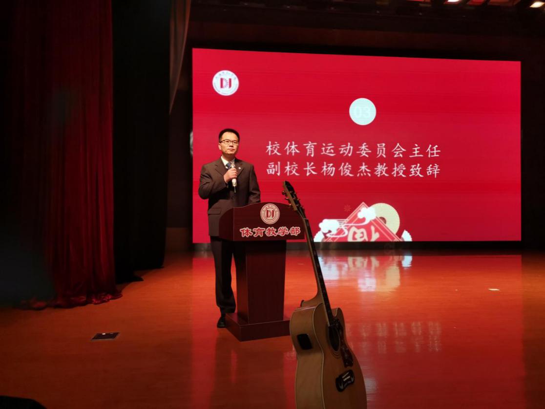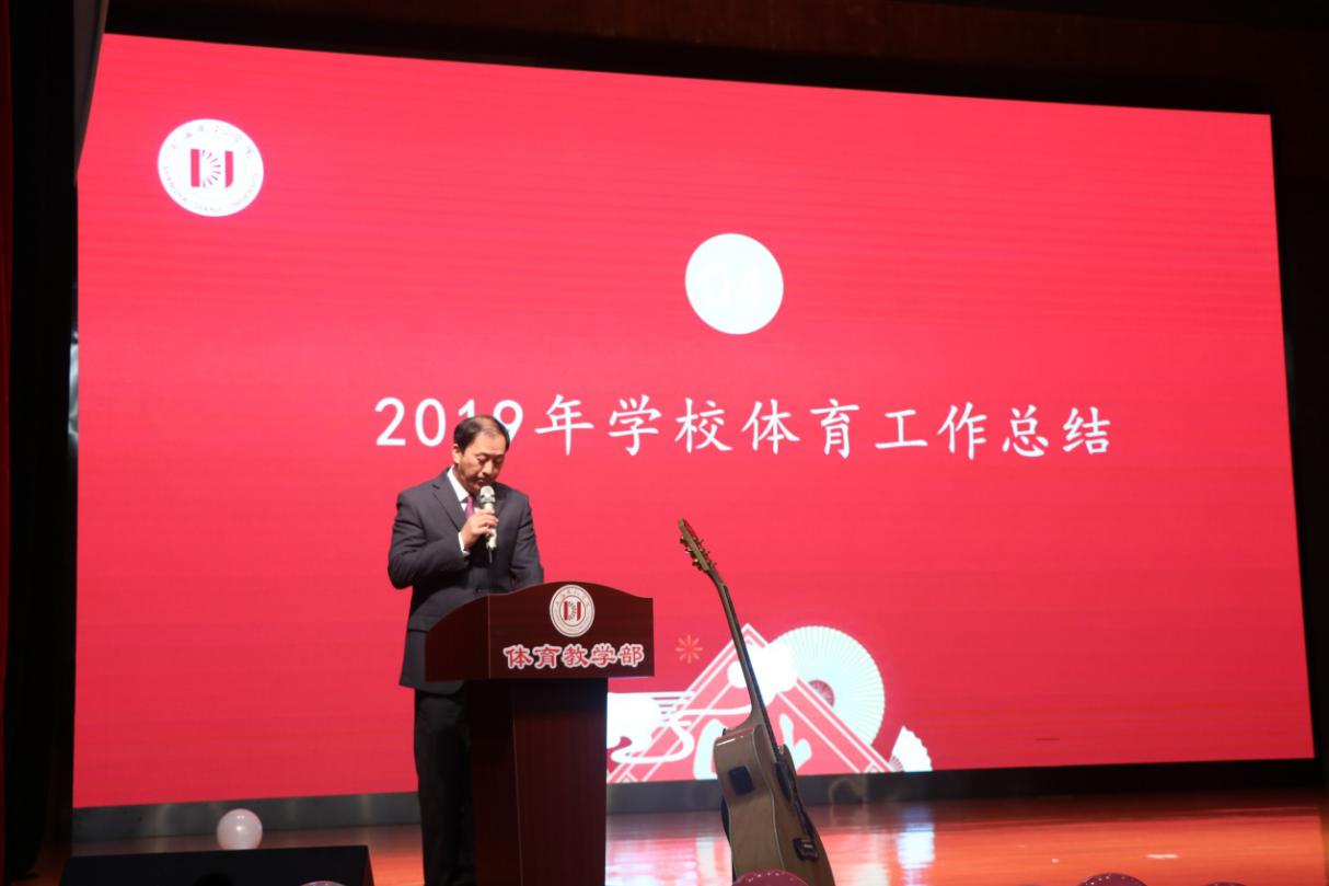 随后,校体育运动委员会秘书长、体育教学部主任孙天明对2019年学校体育工作进行了回顾,和与会师生一起回顾了2019年我校各项体育活动所取得的丰硕成果。他表示在学校党委的正确领导下,学校体育工作部门将努力构建多方协同的大健康教育管理体系,为全校师生的身心健康继续前行。