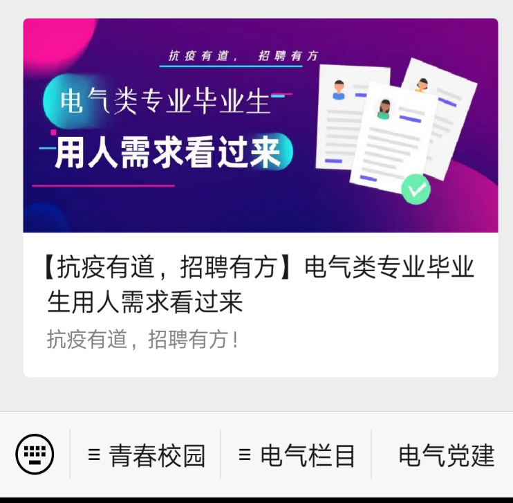 抗疫时期,电气学院全体师生将共克时艰抗疫情,携手互助促就业。我们将充分动员每一位同学积极就业,持续关注每一位同学的就业需求,主动加强每一位就业困难同学的指导!