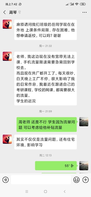德泰1711班的岳同学这个假期一直滞留在广东东莞。因为他的父母春节要东莞的厂里加班,他一放寒假就到了东莞与父母团聚。由于疫情的发生、发展,原计划春节过后就返校的岳同学,团聚也逐渐变成了“滞留”。但是随着工厂的复工,厂里的环境也日益喧闹。在得知这种情况后,学校学工部和学院会商后决定给予岳同学临时补助,建议岳同学短租一个安静的处所,以保障网课学习顺利有效进行。