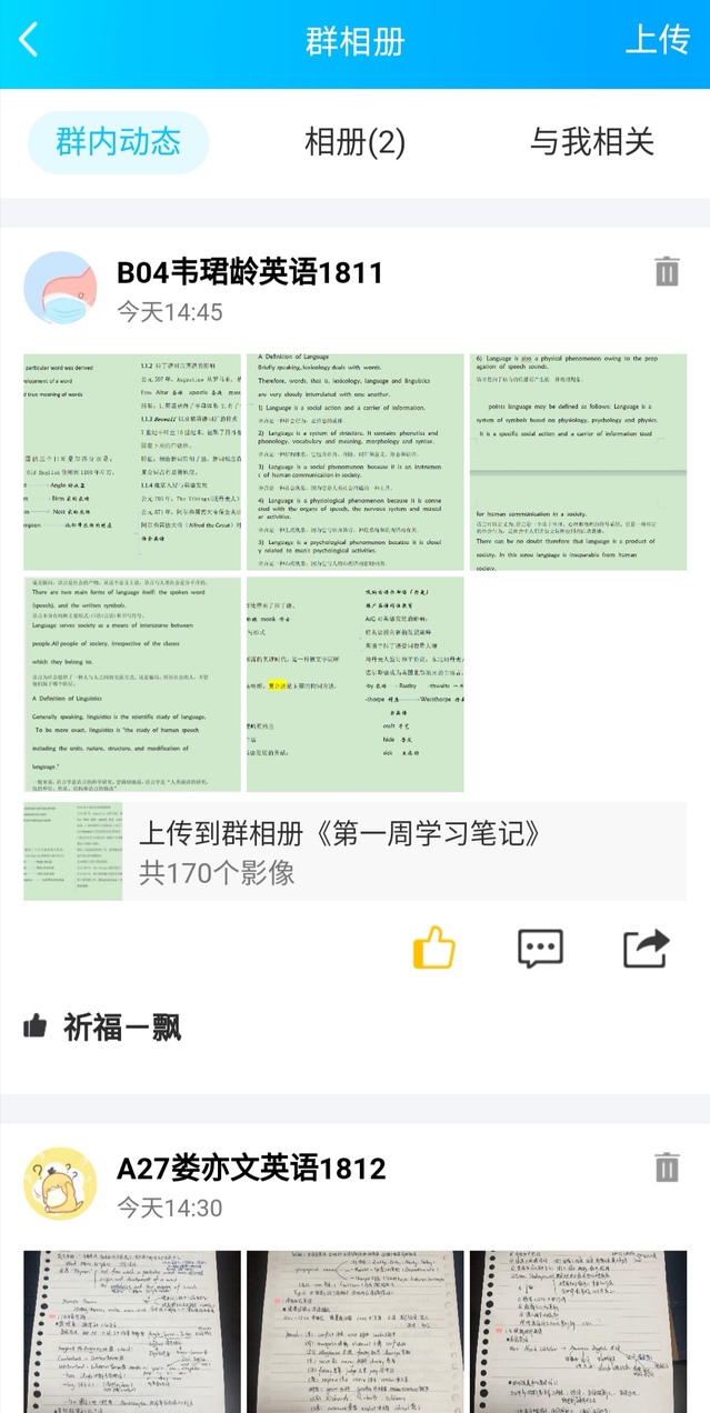 身处武汉的英语1913张楚悦同学:刚开始线上测试的时候,面对全然陌生的平台和各种纷繁复杂的信息,我有些焦虑和不知所措。不过一切的担忧都在打开平台资料库之后消失了,老师在平台上上传的课本练习图片以及详细的ppt让我们倍受鼓舞、信心倍增。通过一个星期的学习,我已经逐渐适应了线上教学。老师除了上传录播视频为我们精心讲解课文的词汇和基础的语法点之外,还随时在线回答问题。看了同学们上传的笔记和优秀作业,我收获颇多。希望疫情过去之后,山河无恙,岁岁长安,等春满校园时,我们能在电机重聚。