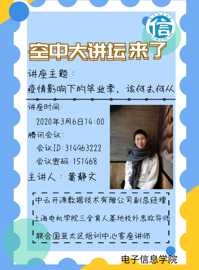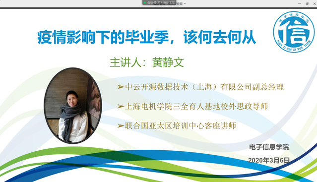 一场突如其来的疫情让处于毕业季的同学们感到焦虑、担忧,电子信息学院第一时间联系并取得了校外思政导师黄静文老师的大力支持,很快确定了讲座的主题、内容和时间。3月6日下午两点,我们依托“腾讯会议”网络平台举行了毕业季首场空中主题讲座——疫情影响下的毕业季,该何去何从,张书娟老师担任主持人。黄老师目前在中云开源数据技术(上海)有限公司任副总经理一职,中云数据是由党总支书记蒋建军亲自带队拓展的三全育人校外实践基地,长期以来一直与我院就支部共建、人才培养、科研合作等方面保持着良好的合作关系,在疫情防控期间还为信息学子提供大量远程办公实习生岗位。