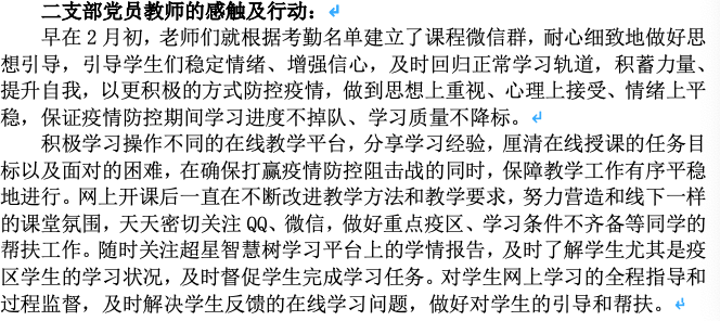 “让党旗在防控疫情斗争第一线高高飘扬”,习近平总书记1月27日作出重要指示,习近平总书记的严明号令、有力动员,鼓舞和激励广大党员干部冲锋在防控第一线。专业教师党员表示,虽然网络授课刚刚起步,备课过程中也遇到很多的困难和挫折,但是网课是远程课程建设的重要组成部分,大家会以饱满的工作热情,认真对待教学,耐心教育引导学生,立足教学岗位发挥党员的先锋模范作用。辅导员们表示,在疫情面前更要履行好自己的职责,按照做实做细的要求,摸清学生实情,根据疫情形势研究调整具体工作目标和时间进度安排,提出务实管用的措施方法,在大后方确保学生的最新动向和身心情况,确保一个都不能少。学生党员们谈到,作为党员,更应密切联系学生,积极号召引领广大学生将“停课不停学”的特殊时期特殊学习方式落实到实际学习中,并细致协助学院掌握学生动态,做好学院与学生之间的桥梁工作,为构建疫情防控的严密防线做出努力,让党旗在防控斗争中一步步高高飘扬。