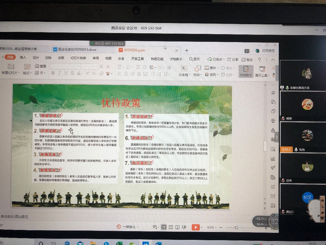 就业工作方面,蒋萌老师向班主任们传达了疫情期间学生实习要求、就业网签流程、纸质四联单发放规定以及线上招聘等相关事项,鼓励毕业生积极上传简历,进行线上应聘和视频面试。彭麟老师通过在线直播文档的方式公布了毕业生就业签约情况和就业状态排摸情况,并就征兵工作情况进行介绍。