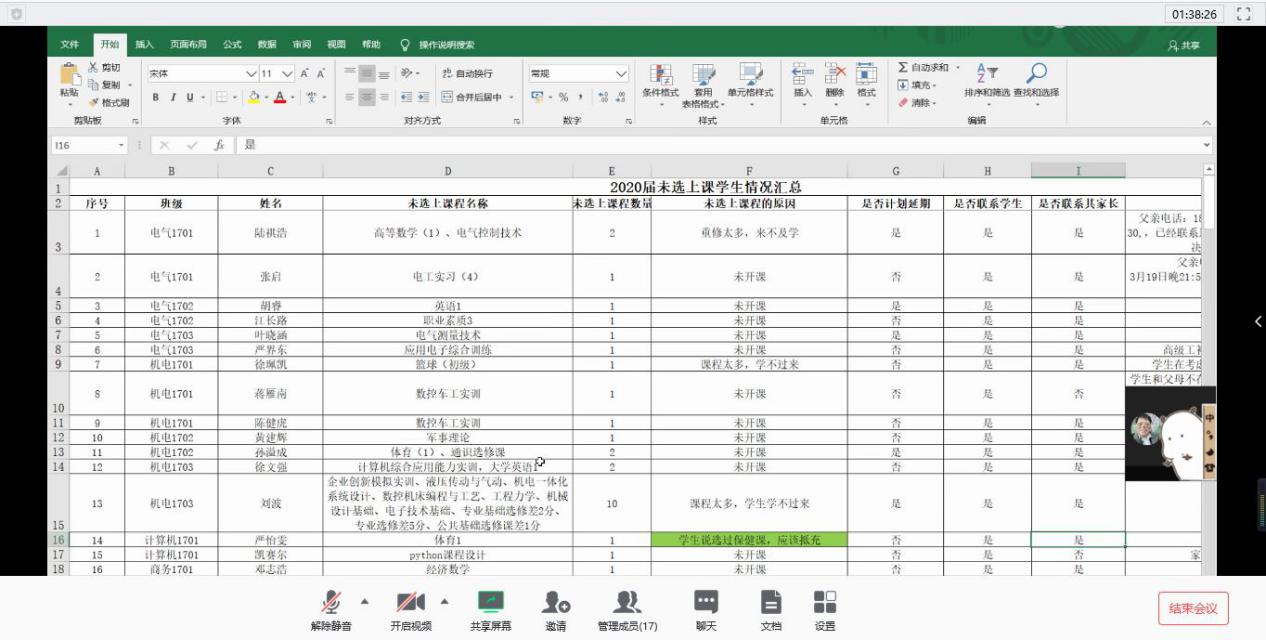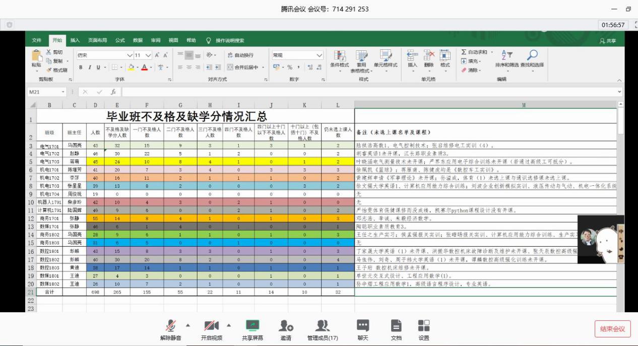 毕业生就业和学业情况是毕业班工作重点关注内容。彭麟老师详细介绍了学院就业摸排情况,汇报了目前学院的签约现状,对毕业生拟升本情况做了详细说明,并着重推荐了近期重点就业单位和学校春季网络招聘会。蒋萌老师通过屏幕共享模式公布了毕业生学业统计明细,汇报了部分学业困难学生沟通情况;各班班主任轮流介绍了分管班级目前毕业生学业情况。