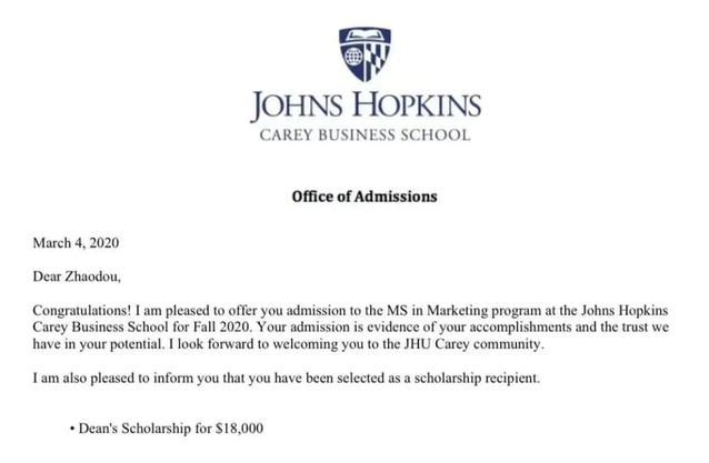 2019年5月开始徐兆豆开始准备GRE(美国研究生入学考试),不到半年的时间里和托福同步学习,最终在同年11月,在这项挑战极限的英文考试中取得了语文加数学320分,写作3.5分的好成绩。2020年是徐兆豆收获的一年,1月份填写了美国学校的网上申请,1、2月份参加部分学校的面试,在3月份获得了约翰.霍普金斯大学市场营销硕士项目的录取通知书。