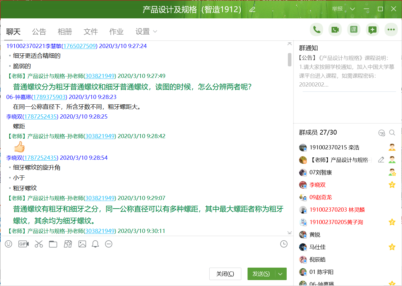 智造1911 周涟漪:线上学习三周以来,《产品设计与规格》这门课程是我学习课程中最特别的一门,因为每节课老师都会在群里进行互动,随机提问当天学习内容有关的问题,大大提高了同学们学习该课程的积极性。在学习《产品规格设计》时会特别认真做好笔记,在课上正确回答出老师提出的问题也会让我十分有成就感。课后老师会在群里详细解答同学们提出的疑问,在这种模式下学生与老师的联系更加紧密,学生与学生之间也能在群里互帮互助共同学习。