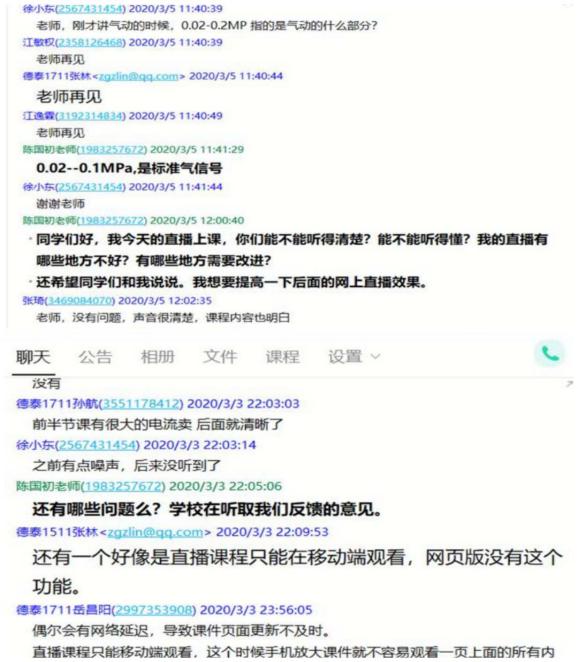 截至目前,线上授课已开展三周,运行平稳。为保证教学效果,除按照课表时间集中答疑外,教师们通过QQ群、微信群等方式提醒学生课前预习、布置作业、课后答疑,并在教学平台上进行问答互动。