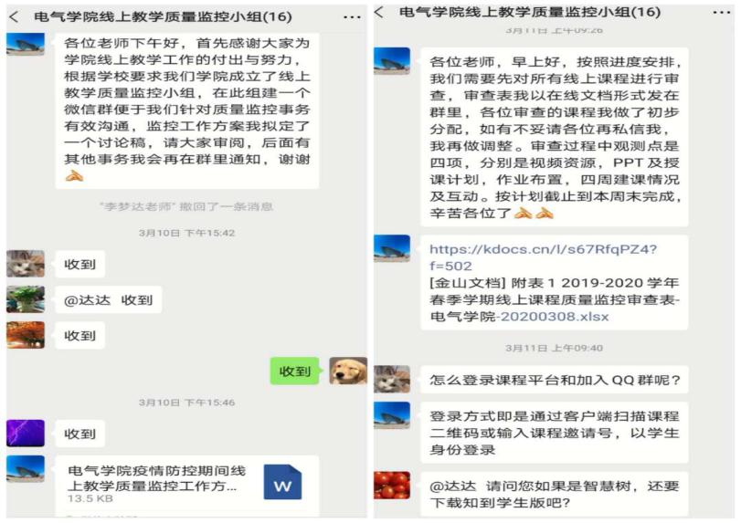 根据学校整体方案,电气学院成立在线教学质量监控督导组,督导组由学院党政班子、系主任、部分副教授以上职称教师组成。定期组织在线会议,布置在线教学质量监控工作。