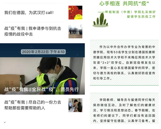 不忘初心,使命在肩,心手相连,共克时艰。智能制造(中德)学院直属党支部的每一位党员师生都团结向上,全力以赴,为取得抗疫工作的最后胜利在不断努力着。(张艺群、李玲)