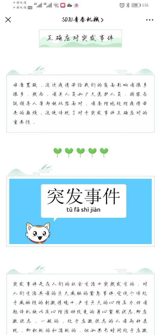 在“抗疫心理”科普宣教方面,学生工作条线教师参加全国高校辅导员网络培训师范班的学习,了解疫情期间的自我心理防范、抗击新型冠装肺炎中的心理应对、公共卫生事件保护等知识,并通过学院公众号、微信、qq等对学生进行宣传指导;同时学院努力普及心理健康相关知识,在微信公众号“sdju青春机械”上以每周一次的频率发布推文,以缓解学生心理压力,引导学生用正确的心态面对此次疫情给学习生活的带来的冲击和挑战。专题推文种类不一,包括学院志愿者参与一线共抗疫情、与心理健康相关的书籍推送、疫情期间的症状科普和应急方法等丰富内容。