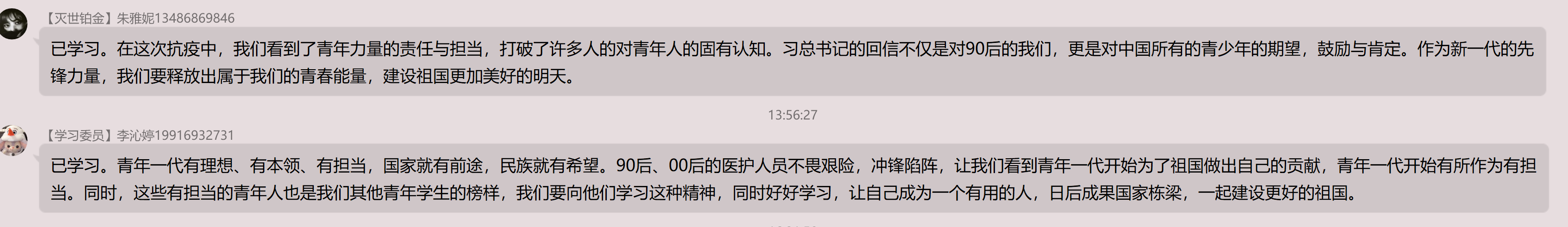这些贡献出自己力量的“90后”、“95后”甚至是“00后”,他们都是同学们学习的对象。他们是抗“疫”过程中不可或缺的坚实后盾、是同学们的学习楷模。这群“90”后甚至是“00”后用自己的实际行动向世人证明了他们勇于担当,争做表率的光辉形象,发挥了自身的青春闪耀力量。他们当之不愧是社会主义的建设者和接班人!最后,两个班级都为此次的学习,录制了视频来表达自己的所思所感。他们希望能够用自己的力量,将正能量传递下去。