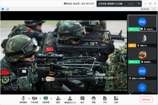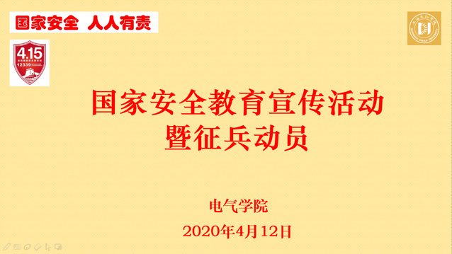 今年4月15日是第5个全民国家安全教育日,今年的活动主题为“坚持总体国家安全观,统筹传统安全和非传统安全,为决胜全面建成小康社会提供坚强保障”。电气学院于4月12日利用线上平台邀请退伍学生为学院学生开展了一堂生动的国防安全教育课,一方面给同学们带来了身临其境的军旅安全教育,另一方面也是一次很好的征兵动员。电气学院党委副书记、副院长卿海龙老师应邀出席,电气学院辅导员代表、5位退伍学生以及各班级学生代表共计170余人参加了本次活动。