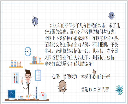 在此次心理健康活动月中,机械学院开展7次疫情科普宣传、发布3部防疫知识动画、开展包括QQ群问答、线上直播、问卷调查等以抗疫为主题的线上班会,旨在帮助学生培育平和理性、积极向上的心态,提升对心理压力和挫折的应对韧性,提升情绪调控能力,为学院学生的健康心理保驾护航。常规活动之外,考虑到线上活动和大学生交友的特点,学院开展了“天黑请闭眼”线上狼人杀活动、“商机”心灵漂流瓶、心愿墙活动、防疫微视频比赛等线上特色心理教育宣传活动。引导通讯们积极面对居家学习,保持良好心态,使生活变得丰富有趣。