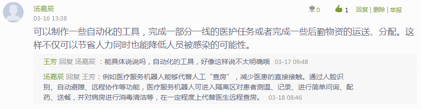 线上授课的六周里,共设计了11个讨论主题,将立德树人作为主线理念,将技术报国、家国情怀、职业品质、工匠精神等思政育人目标融入到讨论中。事实证明同学们对于结合当下时事的主题非常感兴趣,说明当代大学生对于国家的发展和民族的命运十分关心,通过这些主题的讨论,培养了同学们进一步学习技术知识的兴趣,帮助学生树立技术强国的爱国报国情怀。对于同学们的留言,王芳老师都一一给予了点评和回复,进一步也引发了同学们对社会发展问题的思考。