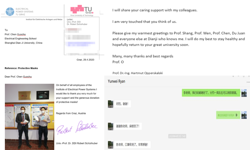 海外师生收到口罩等防疫物资后,纷纷表达对学校及学院的感激之情。海外名师奥地利格拉茨技术大学电力系统研究所所长Robert Schürhuber在感谢信中写道:“我代表电力系统研究所全体员工,非常感谢你们的支持和慷慨捐赠的防护口罩!”海外名师凯撒斯劳滕应用技术大学Hartmut Opperskalski教授回信说:“我会和我的同事们分享你们的关心和支持,我很感动你们想到我们!”在美国、英国等国家的海外名师及访学的老师们也对学校、学院的关心表达了由衷的感谢。在海外访学交流的学生也说到:“非常感谢学校和学院送来的关怀,我们会照顾好自己,有信心打赢这场防疫战。”